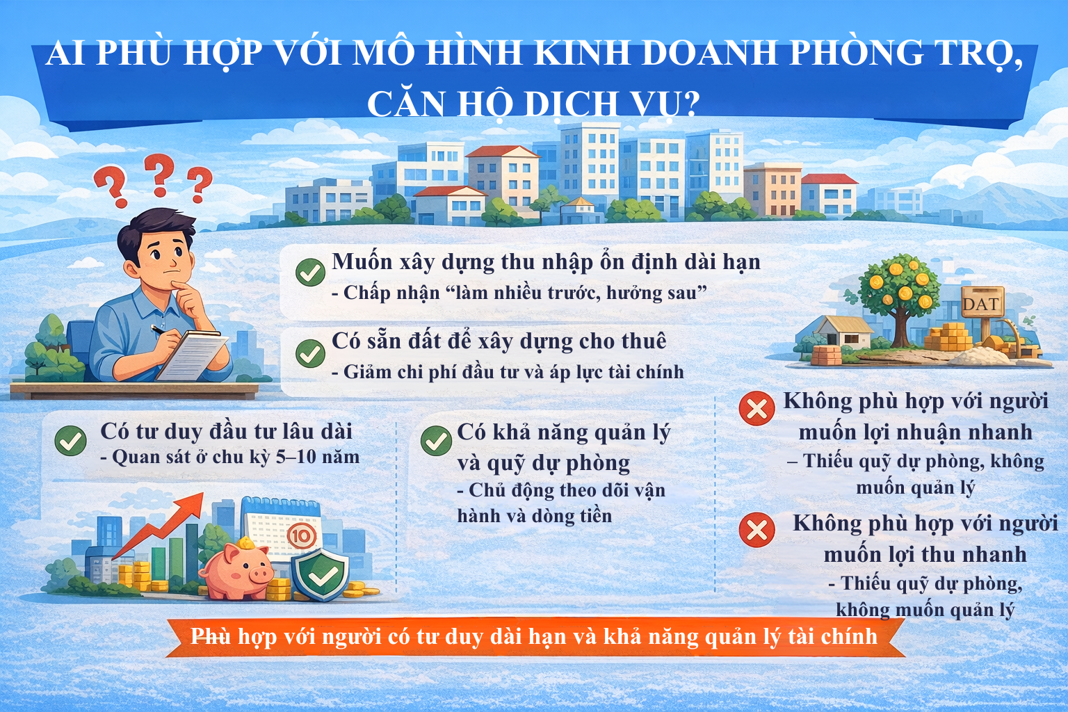 Tóm lại, mô hình kinh doanh phòng trọ và căn hộ dịch vụ không phải là “miếng bánh” phù hợp với tất cả mọi người. Nó phù hợp với người muốn xây dựng thu nhập ổn định, có tư duy dài hạn, sẵn sàng đầu tư công sức ban đầu, có khả năng quản lý và duy trì kỷ luật tài chính. Nó đặc biệt thuận lợi cho những người có sẵn đất hoặc nguồn vốn tương đối vững vàng. Ngược lại, nếu bạn tìm kiếm lợi nhuận ngắn hạn, thiếu quỹ dự phòng hoặc không muốn tham gia vào quá trình vận hành, bạn nên cân nhắc kỹ trước khi bước vào. Hiểu rõ bản thân phù hợp hay không chính là bước đầu tiên để tránh những quyết định đầu tư sai lầm và xây dựng một hệ thống tài sản bền vững theo thời gian.