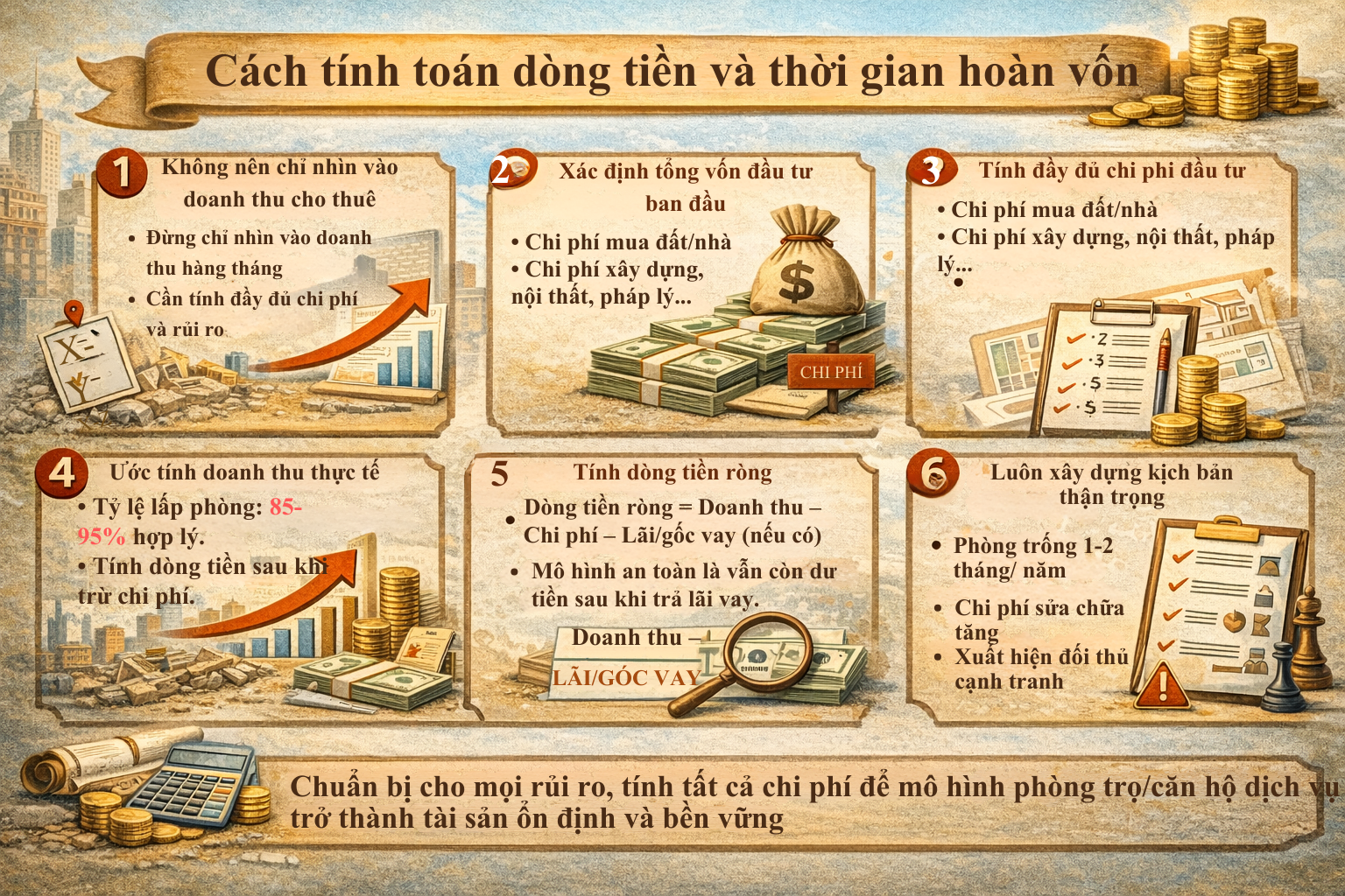 Điều quan trọng nhất trong toàn bộ quá trình lập kế hoạch là tránh “vẽ” lợi nhuận quá đẹp. Nhiều nhà đầu tư mới bị cuốn vào viễn cảnh dòng tiền lớn mà quên tính đến những tình huống xấu nhất. Hãy thử đặt câu hỏi: nếu mỗi năm phòng trống 1–2 tháng thì sao? Nếu giá vật liệu tăng khiến chi phí sửa chữa cao hơn dự kiến thì sao? Nếu khu vực xuất hiện thêm nhiều đối thủ cạnh tranh thì sao? Khi bạn xây dựng mô hình dựa trên kịch bản thận trọng nhất, bạn sẽ có biên an toàn lớn hơn.