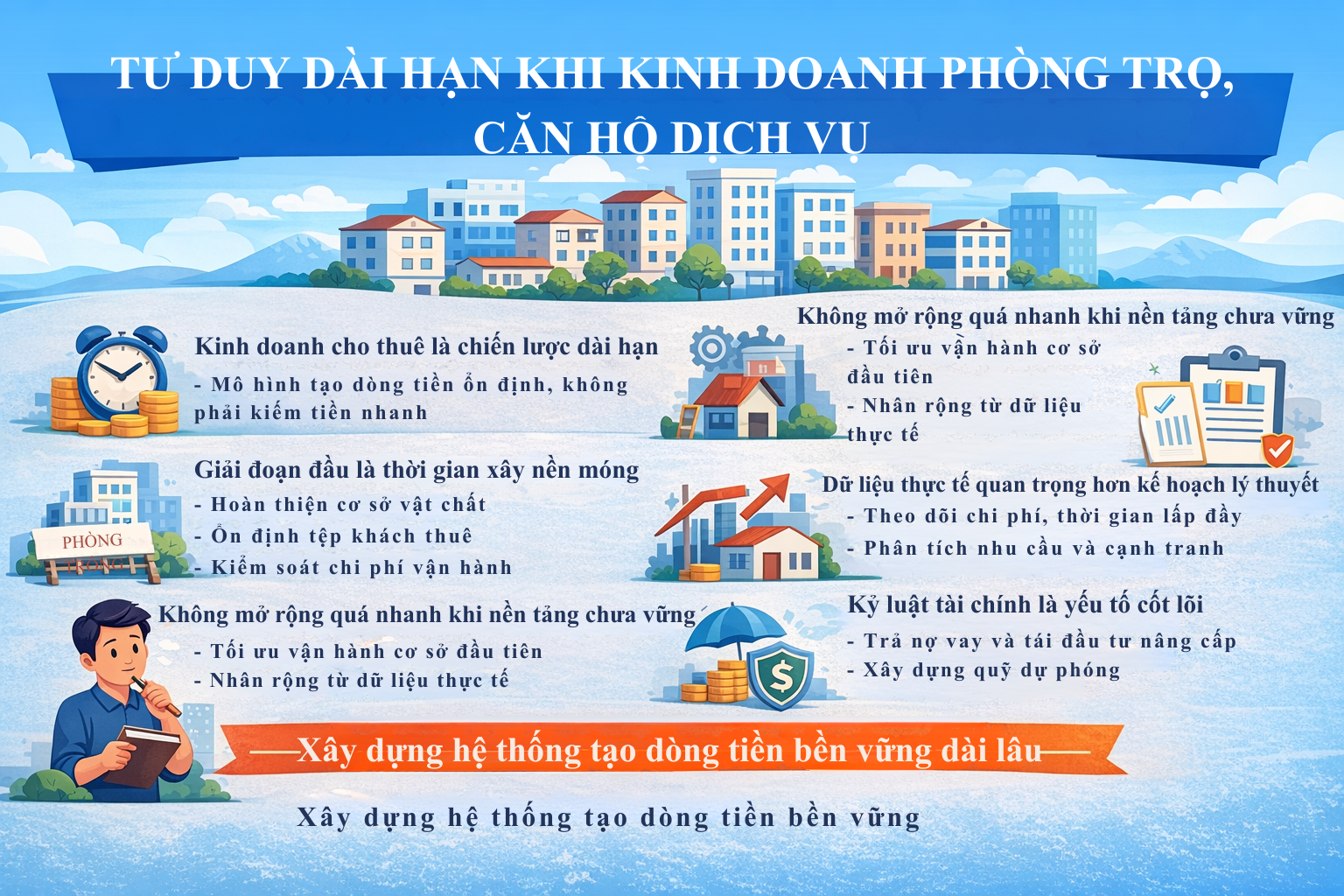Cuối cùng, tư duy dài hạn còn giúp bạn xây dựng thương hiệu cá nhân và uy tín trên thị trường. Khi khách thuê cảm nhận được sự chuyên nghiệp, minh bạch và ổn định, họ có xu hướng ở lại lâu hơn và giới thiệu thêm người quen. Uy tín tích lũy theo thời gian sẽ trở thành một tài sản vô hình nhưng vô cùng giá trị, giúp bạn giảm chi phí tìm kiếm khách mới và nâng cao chất lượng tệp khách hàng. Tất cả những điều này không thể đạt được trong một sớm một chiều. Nó đòi hỏi sự kiên nhẫn, kỷ luật và khả năng nhìn xa hơn những biến động ngắn hạn. Vì vậy, nếu bạn lựa chọn bước vào lĩnh vực kinh doanh phòng trọ hoặc căn hộ dịch vụ, hãy chuẩn bị cho mình tâm thế của một người xây dựng hệ thống dài hạn. Khi bạn kiên trì tối ưu từng chi tiết nhỏ, quản lý dòng tiền chặt chẽ và mở rộng một cách có kiểm soát, bạn sẽ dần sở hữu không chỉ một tòa nhà cho thuê, mà là một nền tảng tài chính bền vững có thể nuôi dưỡng bạn trong nhiều năm tới.