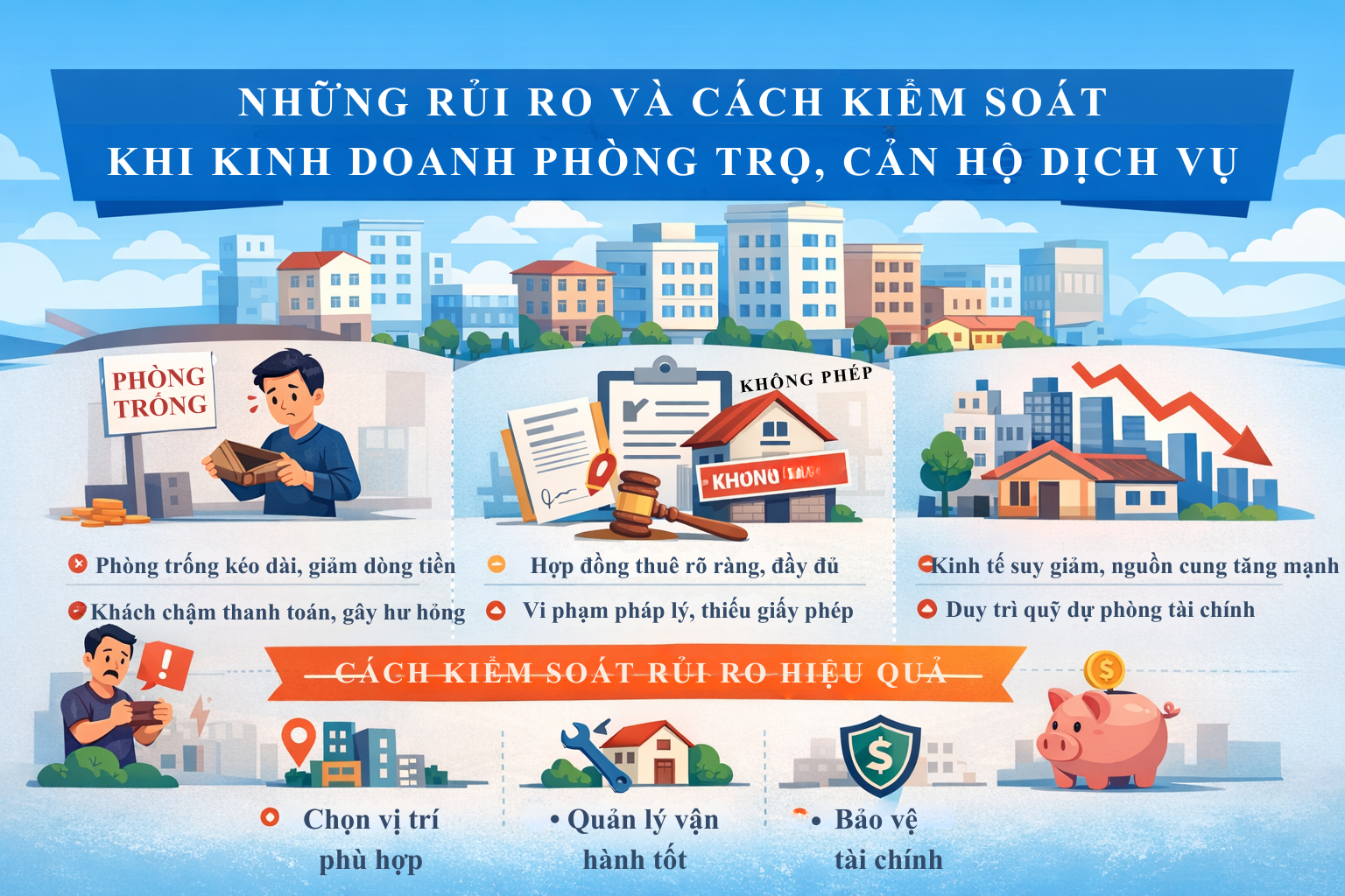 Dù được xem là mô hình tạo dòng tiền đều đặn và tương đối ổn định, kinh doanh phòng trọ hoặc căn hộ dịch vụ hoàn toàn không phải “cỗ máy in tiền” tự động. Bất kỳ hoạt động đầu tư nào gắn với bất động sản và con người đều tồn tại rủi ro. Sự khác biệt giữa nhà đầu tư thành công và nhà đầu tư thất bại không nằm ở việc họ có gặp rủi ro hay không, mà nằm ở khả năng nhận diện sớm và kiểm soát rủi ro đó ở mức thấp nhất.