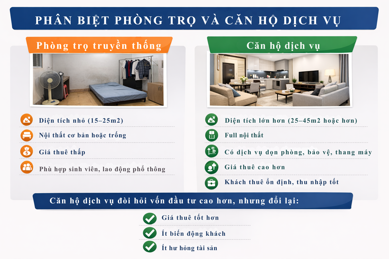 Tóm lại, phòng trọ và căn hộ dịch vụ không chỉ khác nhau ở diện tích hay giá thuê. Sự khác biệt thực sự nằm ở cách bạn định vị sản phẩm, đối tượng khách hàng bạn muốn phục vụ và chiến lược đầu tư bạn lựa chọn. Nếu hiểu rõ điều này và chuẩn bị kỹ lưỡng ngay từ đầu, bạn sẽ tránh được tình trạng đầu tư sai hướng, đồng thời tối đa hóa hiệu quả khai thác tài sản trong dài hạn.