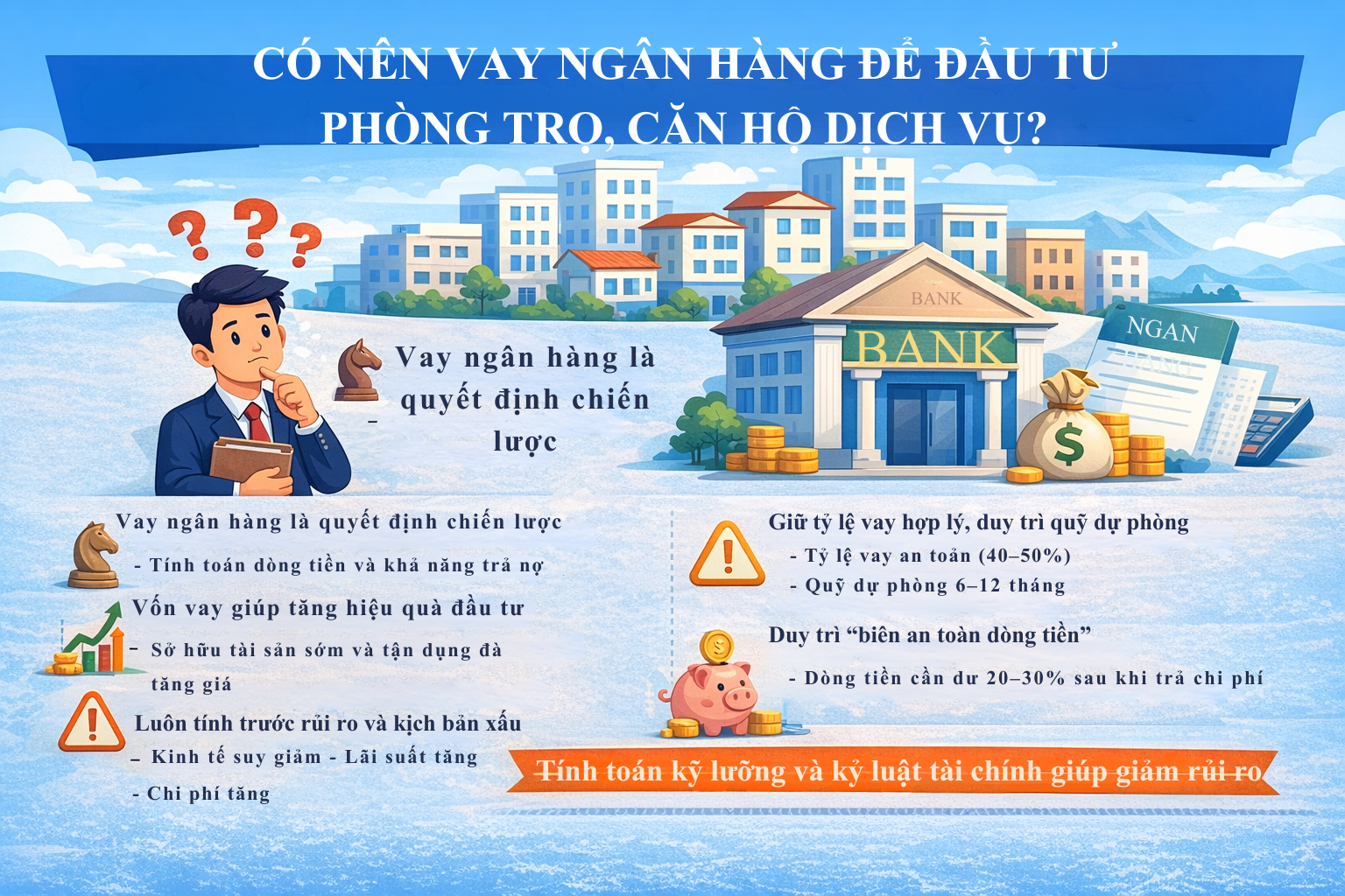 Tóm lại, vay ngân hàng không phải là điều xấu trong đầu tư phòng trọ hoặc căn hộ dịch vụ. Trên thực tế, nếu biết sử dụng đúng cách, đòn bẩy tài chính có thể giúp bạn tăng tốc, mở rộng quy mô và tối ưu hiệu suất sử dụng vốn. Tuy nhiên, vấn đề cốt lõi không nằm ở việc vay hay không vay, mà nằm ở cách bạn thiết kế cấu trúc tài chính và kiểm soát rủi ro. Khi bạn hiểu rõ dòng tiền thực tế, lựa chọn tỷ lệ vay hợp lý, xây dựng quỹ dự phòng vững chắc và duy trì biên an toàn đủ lớn, đòn bẩy sẽ trở thành công cụ hỗ trợ bạn. Ngược lại, nếu bạn vay theo cảm tính, quá tự tin vào kịch bản “lúc nào cũng kín phòng” hoặc đánh giá thấp biến động thị trường, bạn đang tự đặt mình vào thế rủi ro cao trong nhiều năm. Trong đầu tư dài hạn, sự thận trọng và kỷ luật tài chính không làm bạn chậm lại – mà chính là nền tảng giúp bạn đi xa hơn và bền vững hơn.